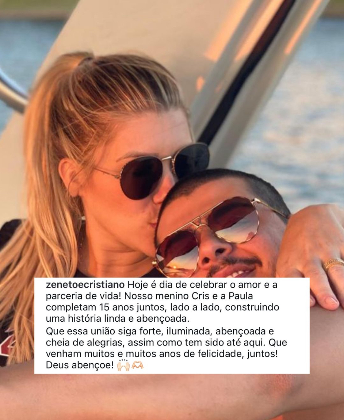 O cantor sertanejo Cristiano, dupla de Zé Neto, comemorou ontem (29), quinze anos de casado com Paula Vaccari, com quem possui três filhos. Durante a viagem para Angra dos Reis, especialmente realizada para a comemoração, o casal se declarou nas redes sociais e ganhou até homenagem no perfil oficial de Zé Neto & Cristiano: “Hoje é dia de celebrar o amor e a parceria de vida! Nosso menino Cris e a Paula completam 15 anos juntos, lado a lado, construindo uma história linda e abençoada” foi publicado no Instagram.