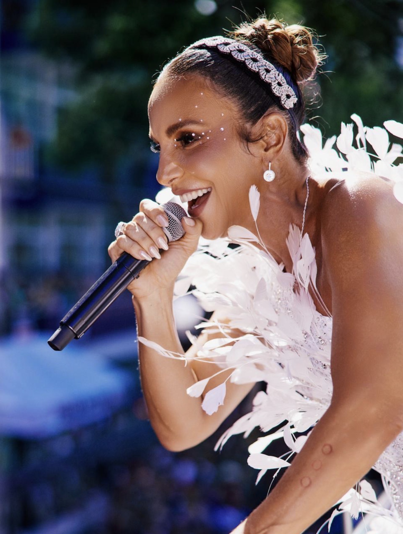 Mais uma vez, Veveta usou um figurino assinado por Patrícia Zuffa, todo prateado, com penas brancas. O look foi pensado, como sempre, para o conforto que Ivete precisa à frente do trio. A beleza ficou por conta de Markito Costa.