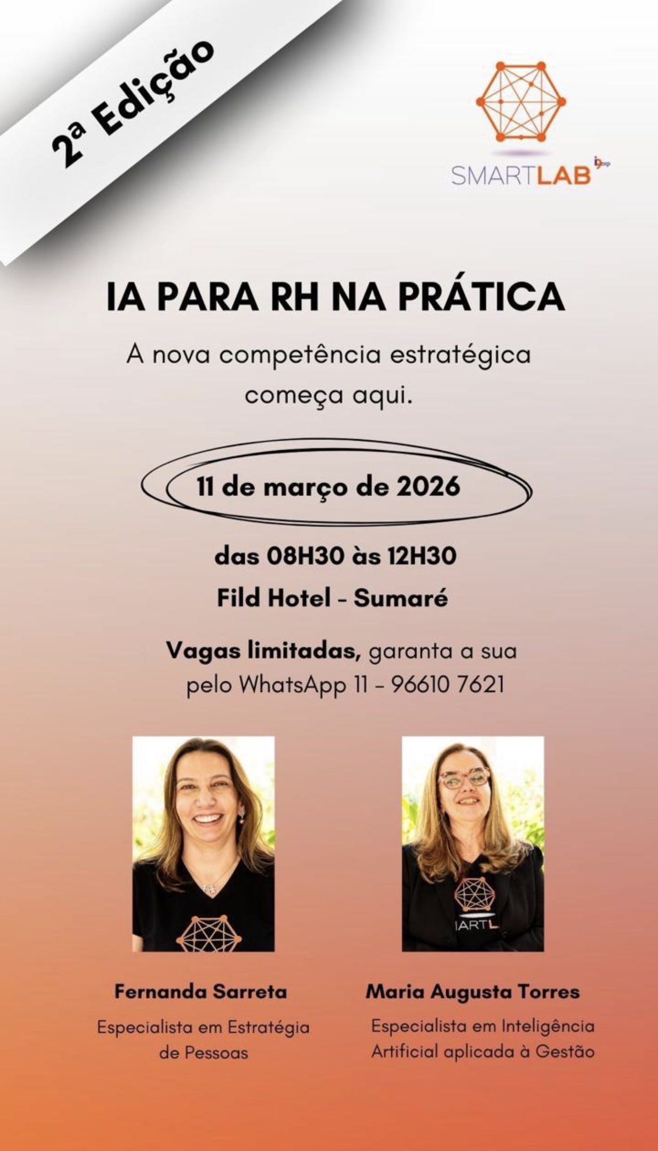 A imersão será liderada por Fernanda Sarreta, referência em Estratégia de Pessoas, e Maria Augusta Torres, especialista em Inteligência Artificial aplicada à Gestão, que trazem ao encontro uma abordagem prática, estratégica e alinhada aos desafios reais das empresas.