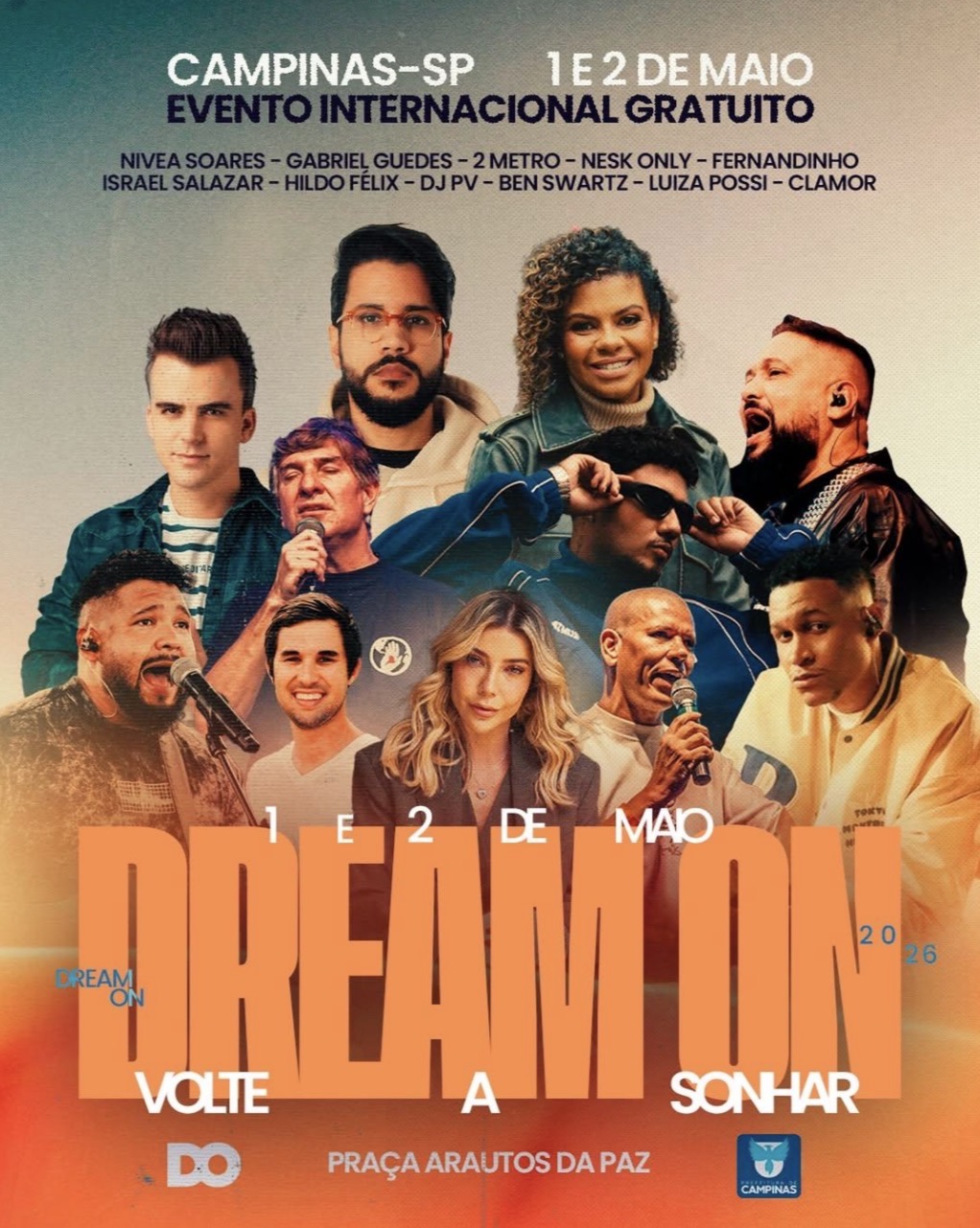 Com mais de dez atrações confirmadas, o movimento reúne artistas do gospel que são conhecidos do público, como Fernandinho, Nívea Soares, Gabriel Guedes, DJ PV, Israel Salazar e Luiza Possi, além de nomes como 2Metro, Nesk Onlye o coletivo Clamor Pelas Nações. A programação começa na sexta-feira (1º), às 18h30, e segue no sábado (2), a partir das 17h.Criado nos Estados Unidos e já realizado em diferentes países, o Dream On Brasil propõe uma experiência que vai além das apresentações musicais, com foco em inspiração, propósito e desenvolvimento pessoal. Em Campinas, o movimento acontece desde 2022 e já impactou cerca de 180 mil pessoas da região. Com público majoritariamente jovem, entre 16 e 40 anos, a iniciativa vem registrando crescimento médio de aproximadamente 20% ao ano, consolidando sua presença no calendário da cidade.